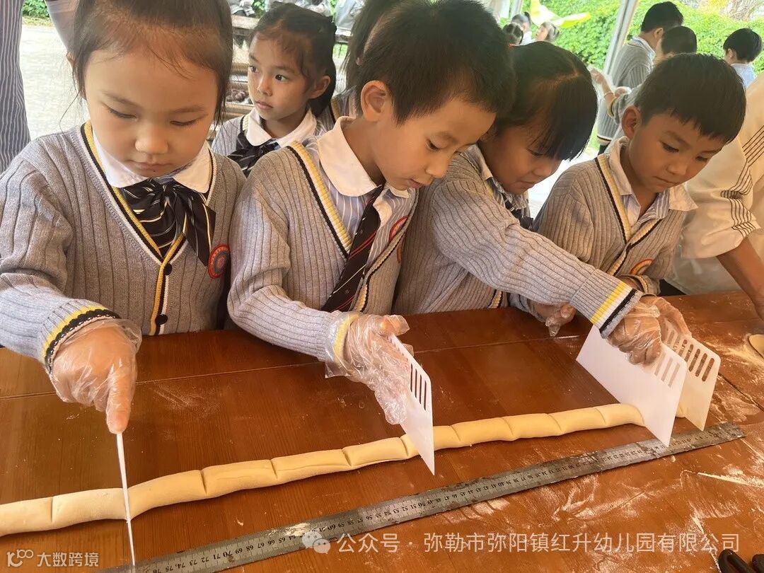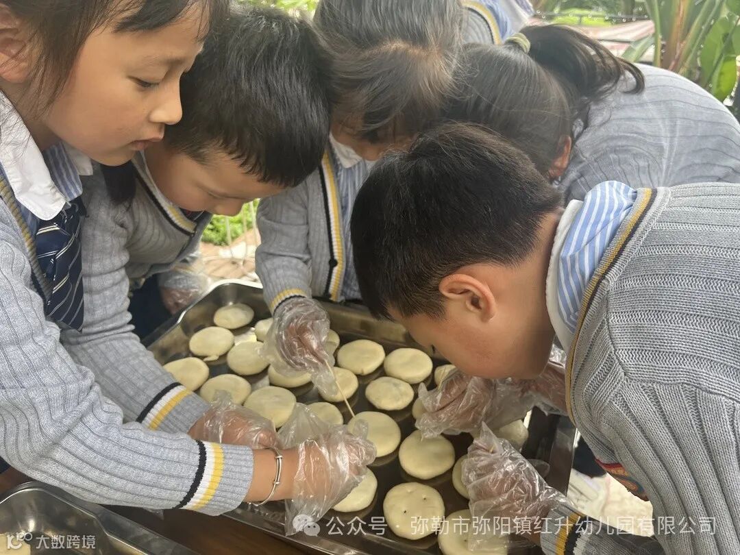 孩子们高兴的观察了玫瑰酱的变化,看一看颜色,摸一摸质感,再闻一闻味道:嗯,完美的玫瑰花酱。再来称重、擀皮、搅拌玫瑰酱、包馅、扎孔、烘烤…一步一步,对于孩子们来说并不容易,需要耐心的练习和老师的指导,原来一道美食的形成是需要这么多步骤的啊!