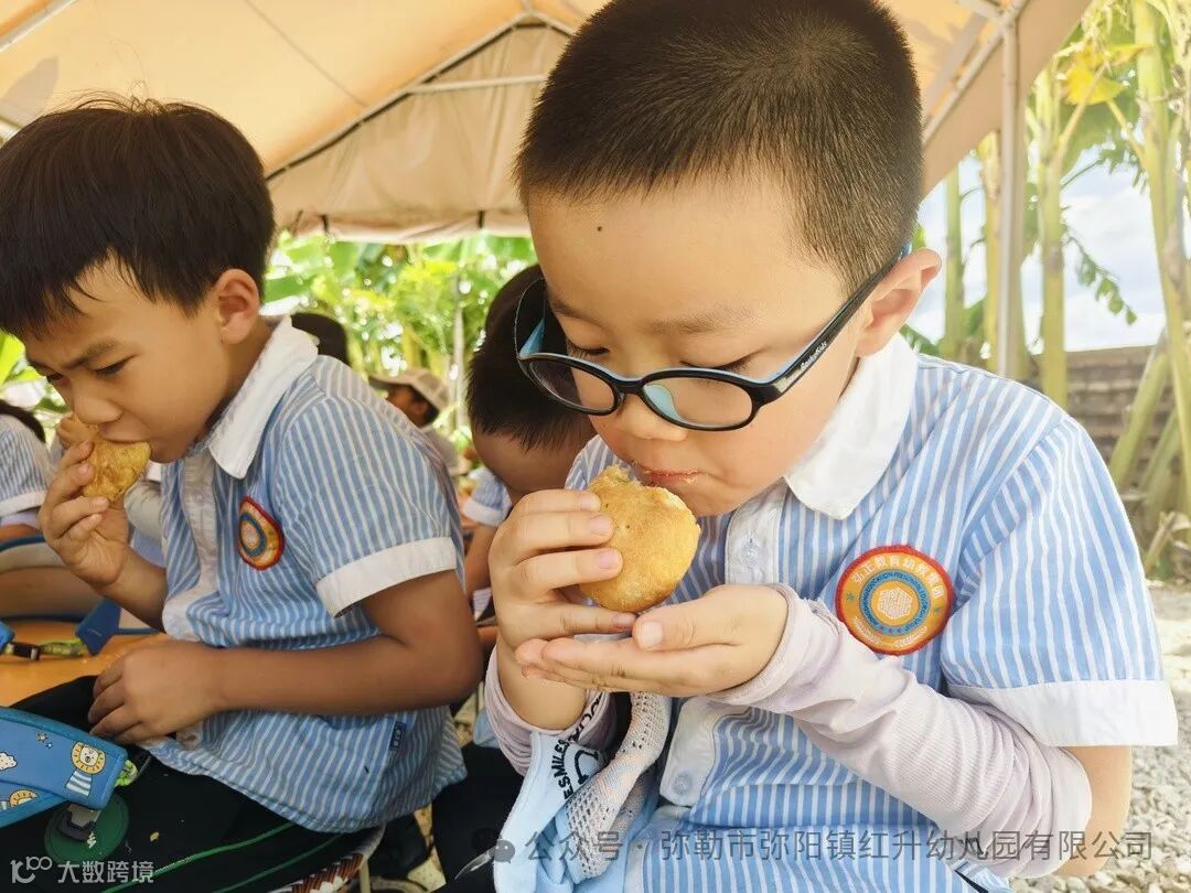 小朋友们在品尝到刚出炉的鲜花饼说:“现烤的鲜花饼可真好吃呀!”