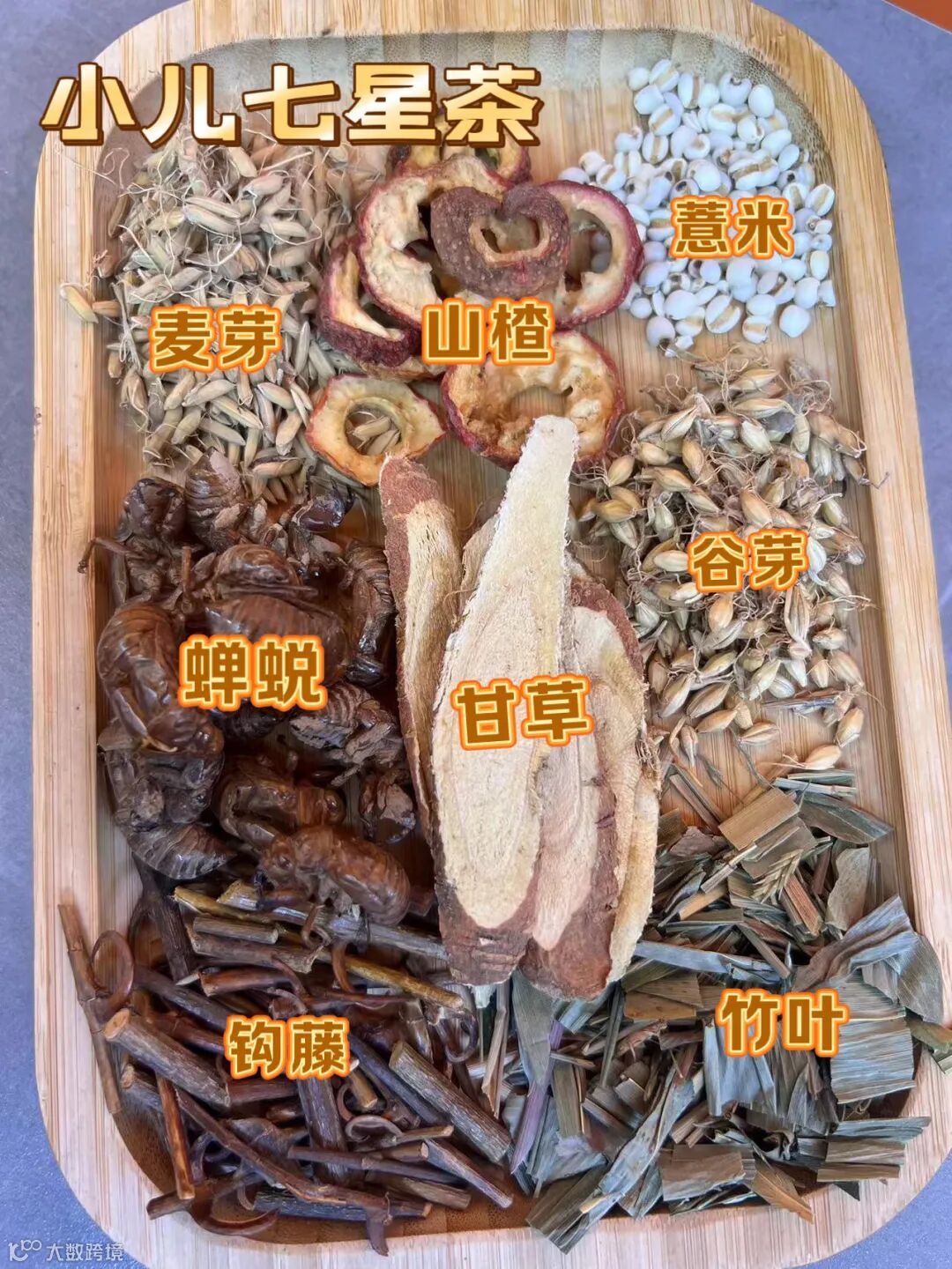 蝉蜕、钩藤、山楂、竹叶、甘草、麦芽、薏米