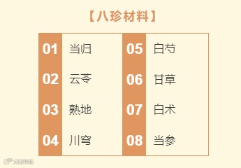 当归、云苓、熟地、川芎、白芍、甘草、白术、当参、乌鸡半个。