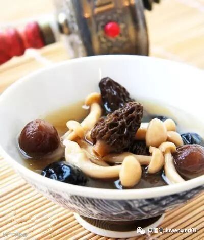 材料:羊肚菌8个、真姬菇适量、黑枣7个、桂圆3个、食盐适量、高汤适量