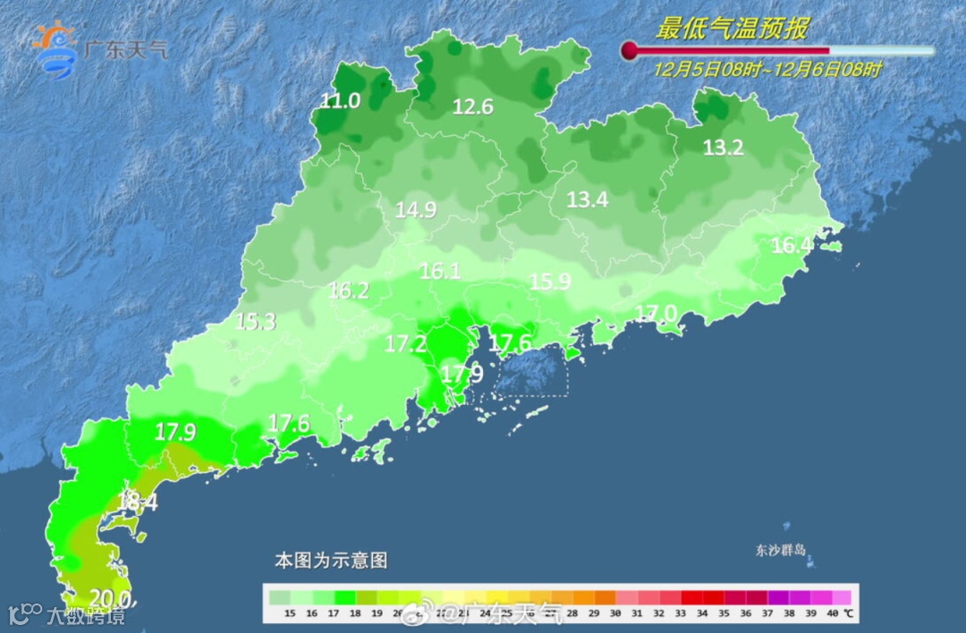 预计,12月6日弱冷空气补充南下,部分市县有小雨,气温略有下降。其中韶关和梅州12月6日和7日最低温仅9℃。