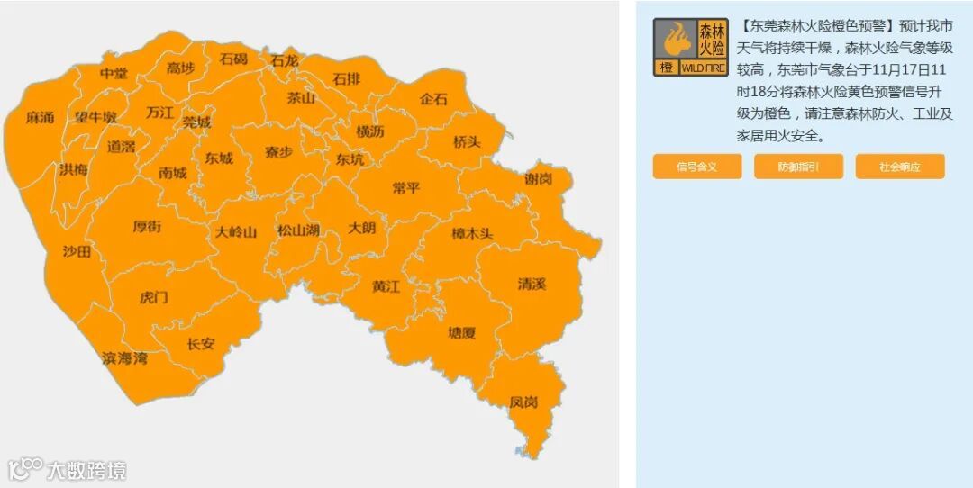 此外,东莞森林火险橙色预警持续生效,要注意森林防火、工业及家居用火安全。