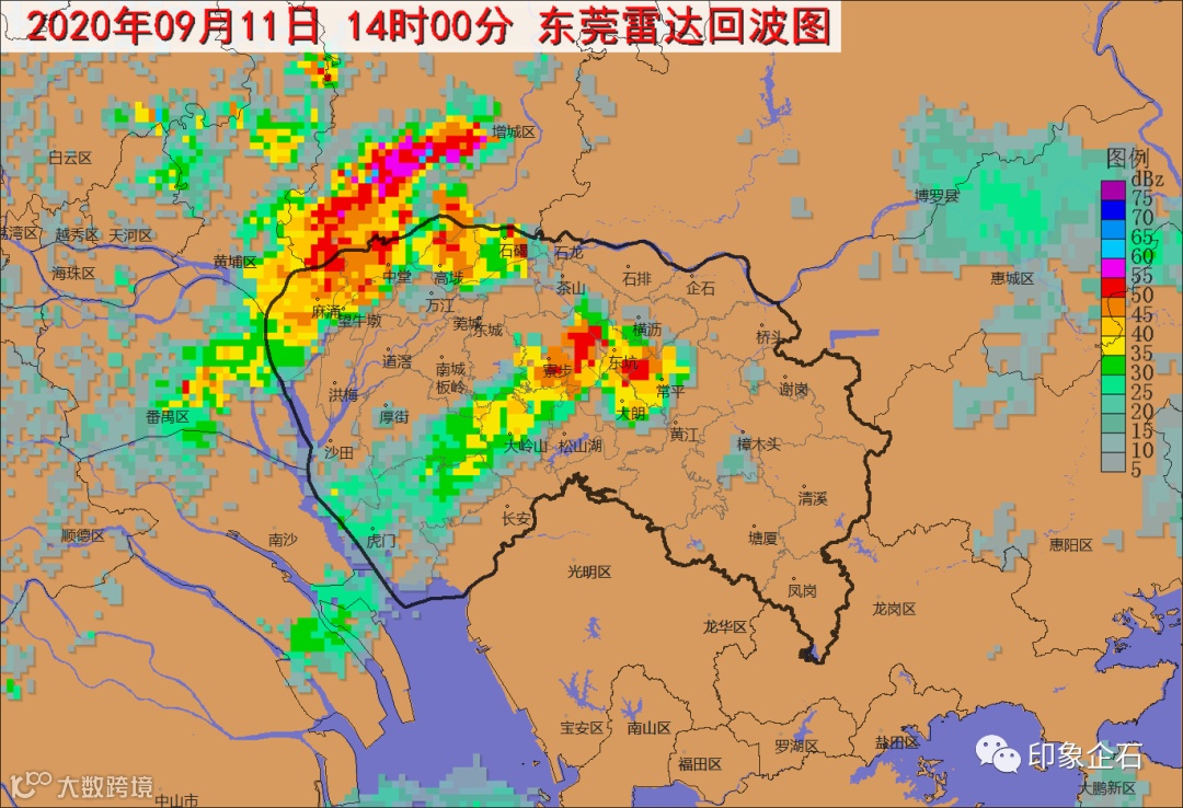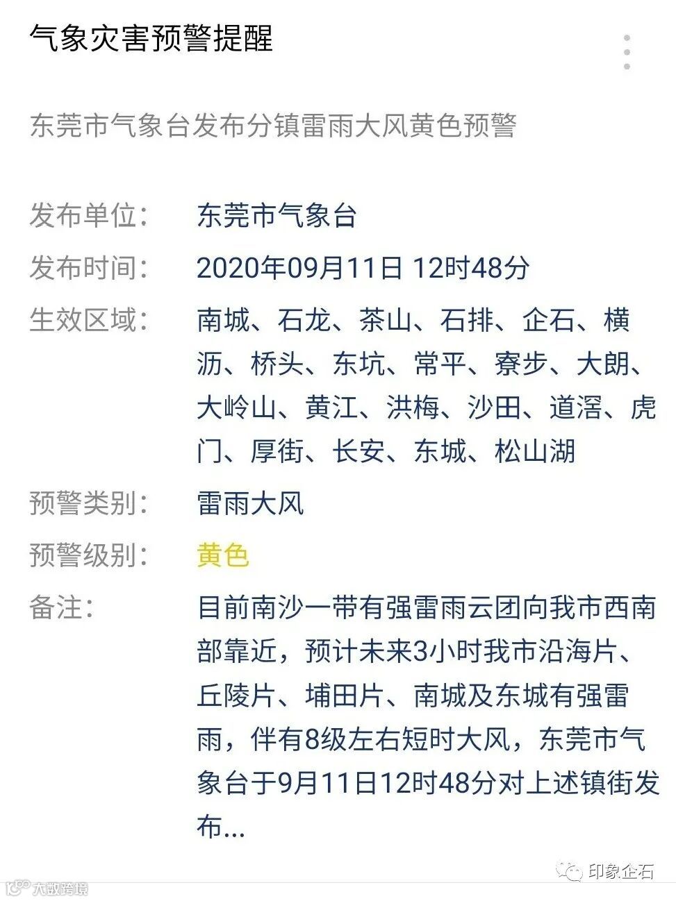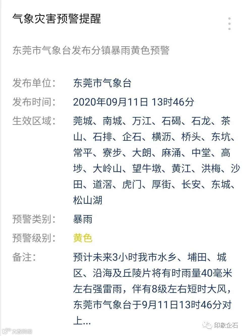 目前,我市西部已出现强雷雨,最大降雨量为沙田42.5毫米,预计未来3小时我市水乡、埔田、城区、沿海及丘陵片将有时雨量40毫米左右强雷雨,伴有8级左右短时大风,东莞市气象台于9月11日13时46分对上述镇街发布暴雨黄色预警信号,请注意防御。