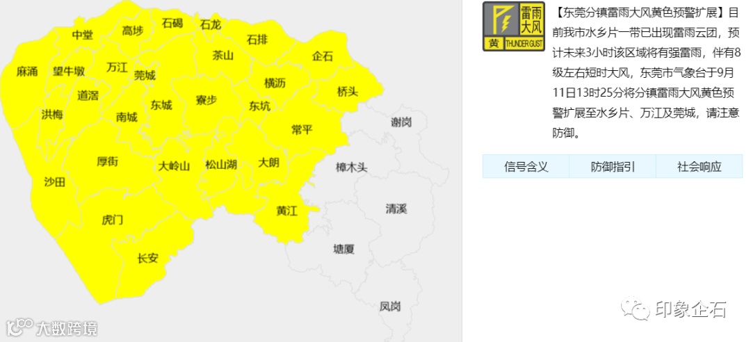东莞分镇雷雨大风黄色预警扩展,目前,我市水乡片一带已出现雷雨云团,预计未来3小时该区域将有强雷雨,伴有8级左右短时大风,东莞市气象台于9月11日13时25分将分镇雷雨大风黄色预警扩展至水乡片,请注意防御。