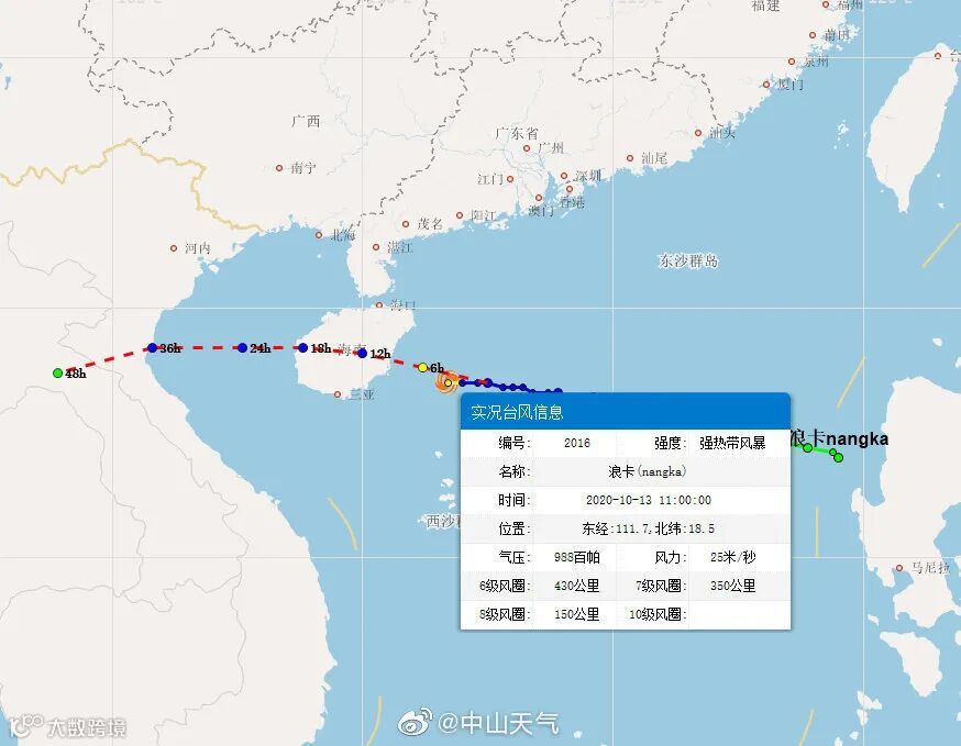 今天11时,台风“浪卡”已经加强为强热带风暴(10级,25米/秒),中心气压988hPa,于南海西北部海面,距离海南省万宁市东偏南方向约140公里,预计“浪卡”将以每小时20公里左右的速度向西偏北方向移动,将于今天(13日)傍晚前后在海南陵水到文昌一带沿海登陆。