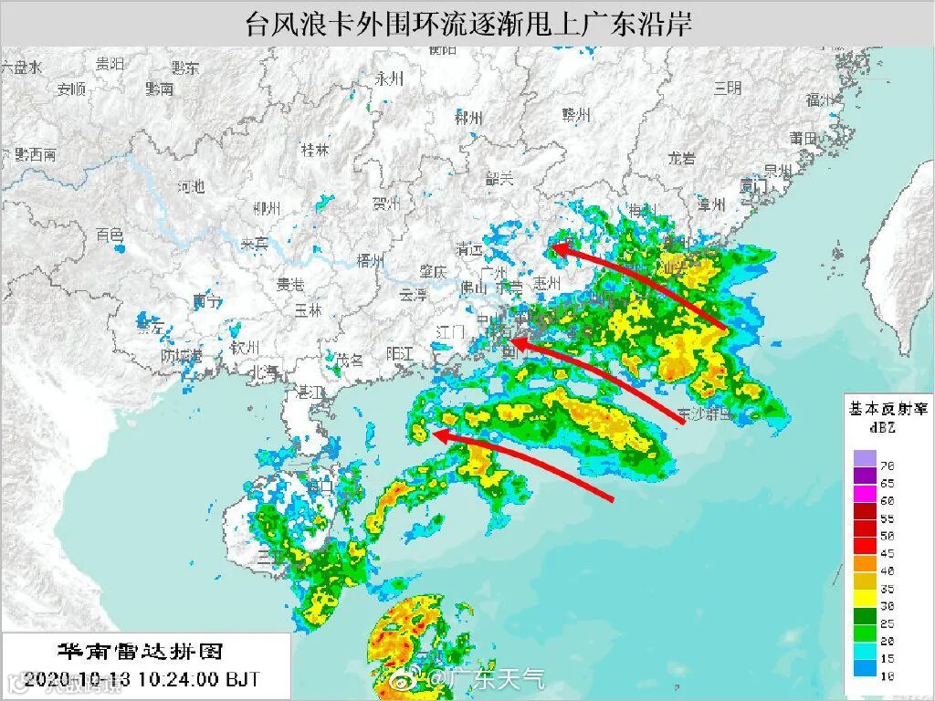 从监测资料可见,台风“浪卡”体型庞大,结构不对称,位于台风中心东北象限的外围环流云带有所发展,并逐渐靠近广东沿海。