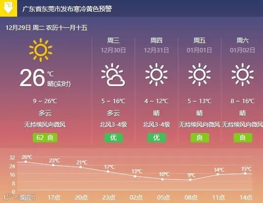 29日08时,寒潮前锋已到达湖南、江西中部地区,预计29日中午前后寒潮将到达粤北地区。29日白天我市以多云为主,最高气温在26-27℃,体感温暖
