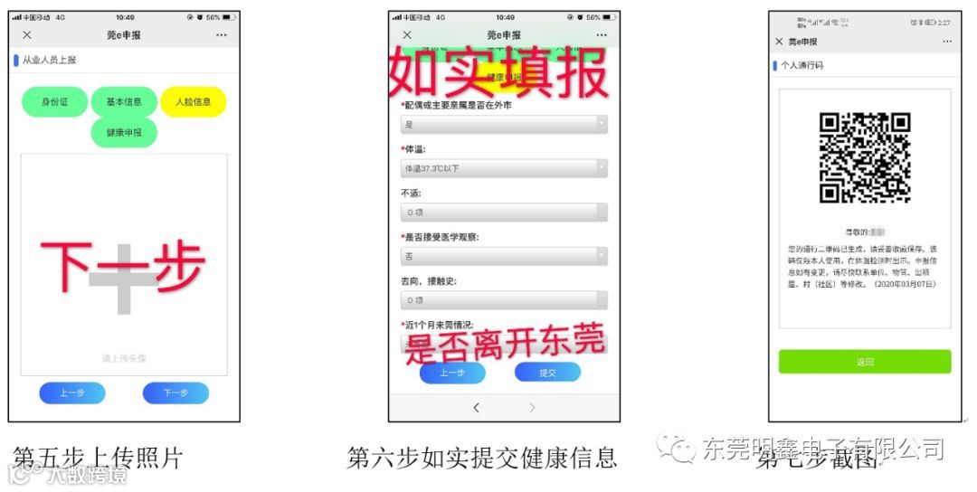 请各位员工自行扫二维码,继续完善填写健康申报。如未成功录入"莞e申报",请自行录入资料,提交成功请保留通行证二维码。