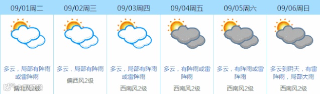 预计,我市9月1日-3日多云,局部有阵雨或雷阵雨,天气炎热;