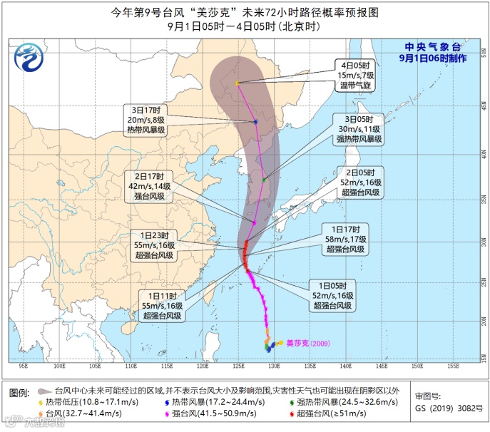 预计,“美莎克”将以每小时15-20公里的速度,向北偏西转偏北方向移动,强度变化不大或略有增强;9月1日夜间,在东海北部转向北偏东方向移动,移速逐渐加快,趋向朝鲜半岛南部,强度逐渐减弱。