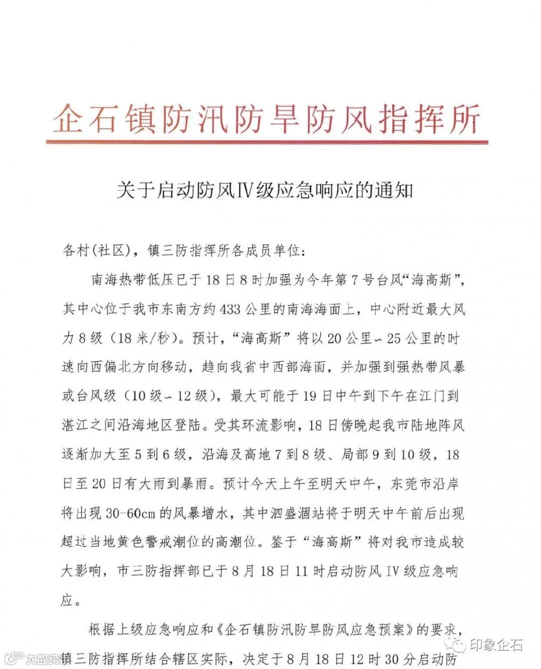 根据上级应急响应和《企石镇防汛防旱防风应急预案》的要求,镇三防指挥所结合辖区实际,决定于8月18月12时30分启动防风IV级应急响应。请各村(社区)和各成员单位加强值班值守, 密切关注天气变化,按应急响应要求做好各项防御工作,并做好信息报送工作。请各抢险救援队伍做好抢险救灾准备。