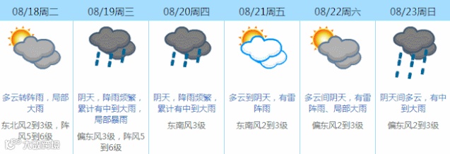 8月18-19日受台风环流影响,有明显风雨过程,请提前做好防御,并注意海岛旅游及海上交通安全;请注意防御持续性强降水及其引发的城乡积涝及地质灾害。