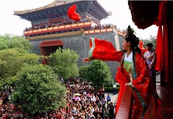 中秋之夜有些地区有抛帕招亲的习俗。是夜,于广场中搭一彩台,布置成月宫景状,并设玉兔、桂树等。未出嫁的姑娘扮成嫦娥,在欢庆歌舞之后,姑娘们将一些绣着不同花色的手帕向台下抛去。