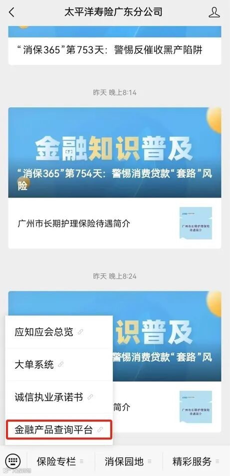 点击【保险专栏】-【金融产品查询平台】