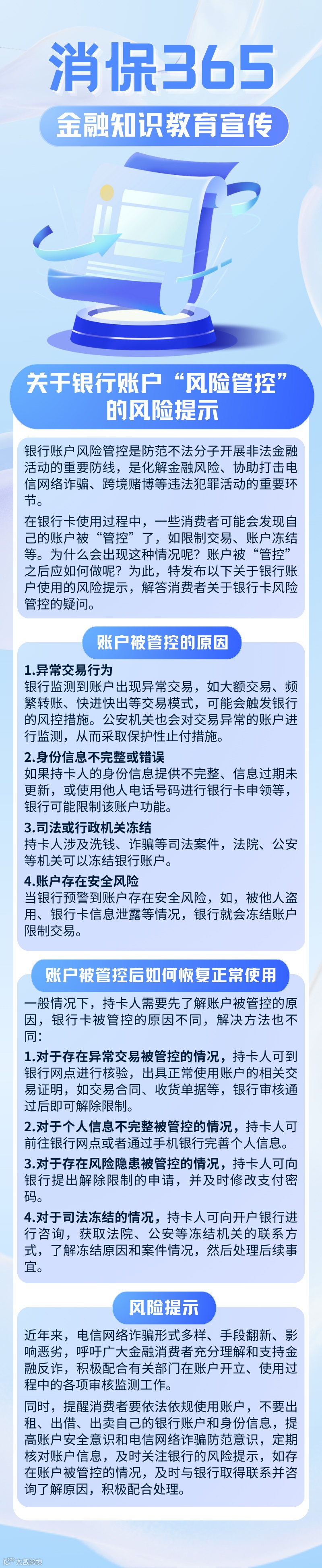 “消保365”第557天:【金融教育宣传月】关于银行账户“风险管控”的风险提示