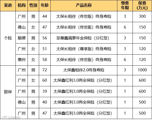 广州投保人为72岁男性,为其44岁儿子投保我司太保鑫相伴2.0终身寿险,保费1000万元,3年缴清。