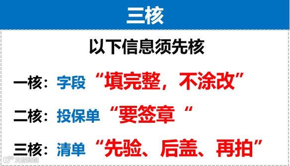 为降低返单率,提升承保时效,请业务伙伴按照“三核三拍三返一交回”的标准流程作业。