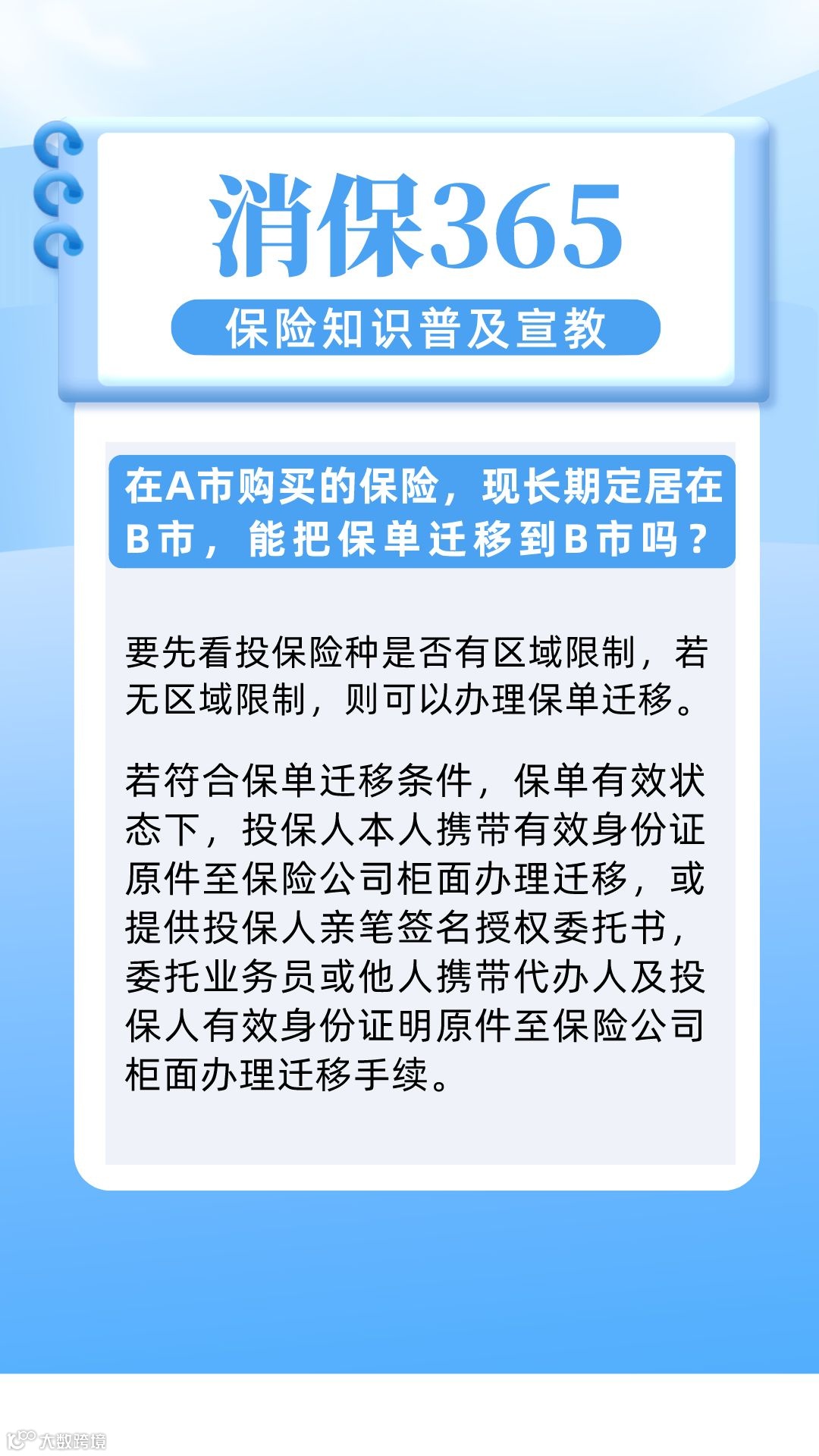 “消保365”第173天:在A市购买的保险,现长期定居在B市,能把保单迁移到B市吗?