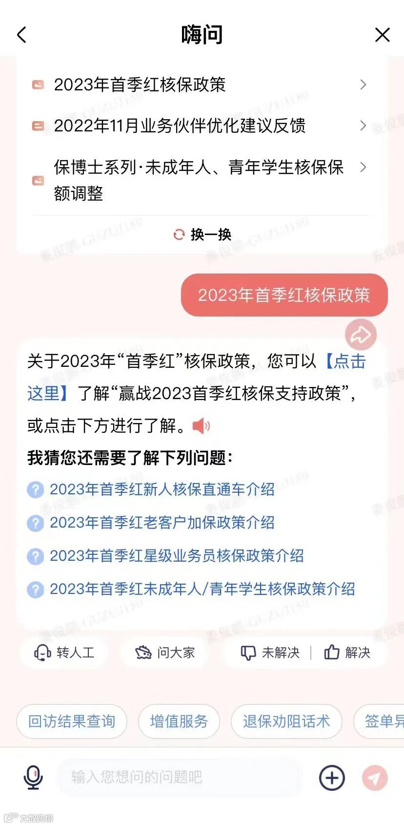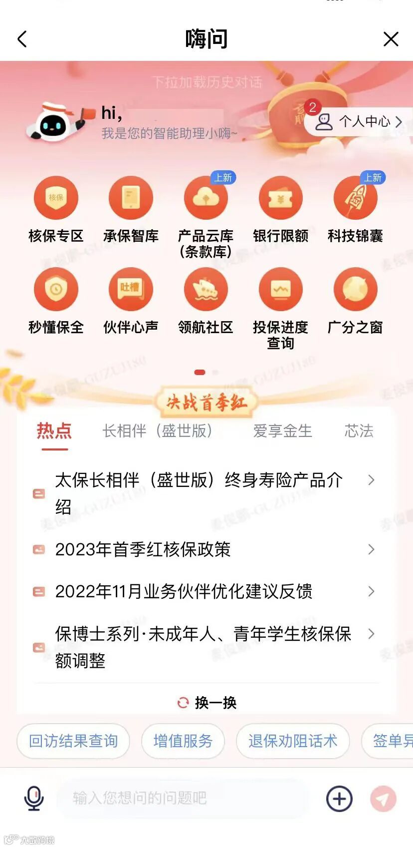科技个险→点击嗨问图标→提问