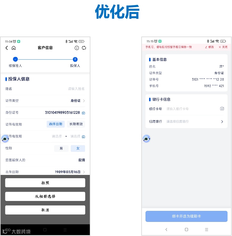 证件号、证件有效期、银行卡可通过OCR拍扫系统自动识别并填入对应信息栏。