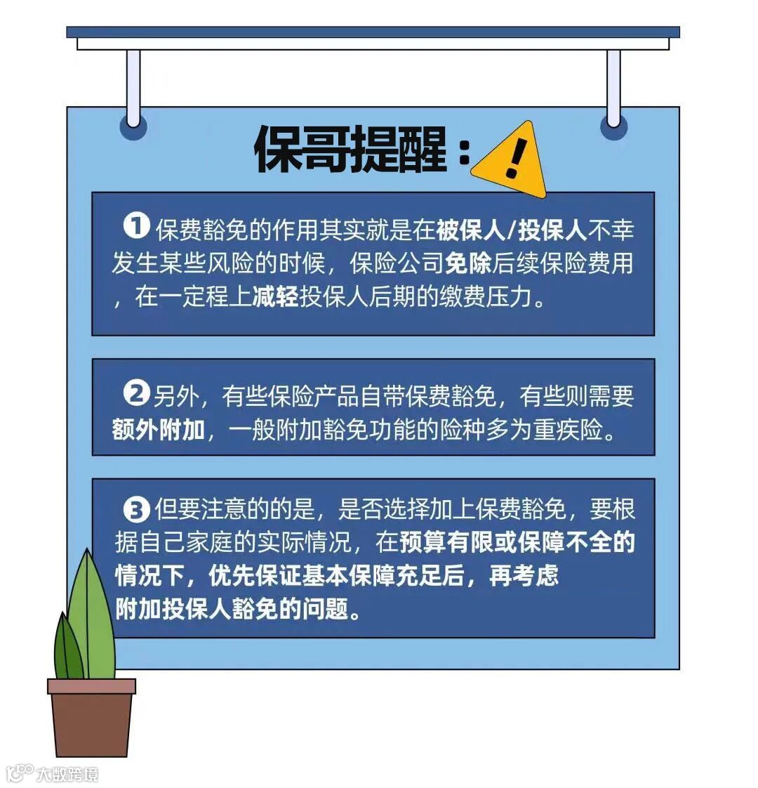 要不要选择保费豁免,还是要看个人实际情况。保费豁免可以锦上添花,但不是必须的选项。选择保险产品,最重要的是核心保障内容,要在重要时刻发挥作用,规避风险来临,延续爱的守护。