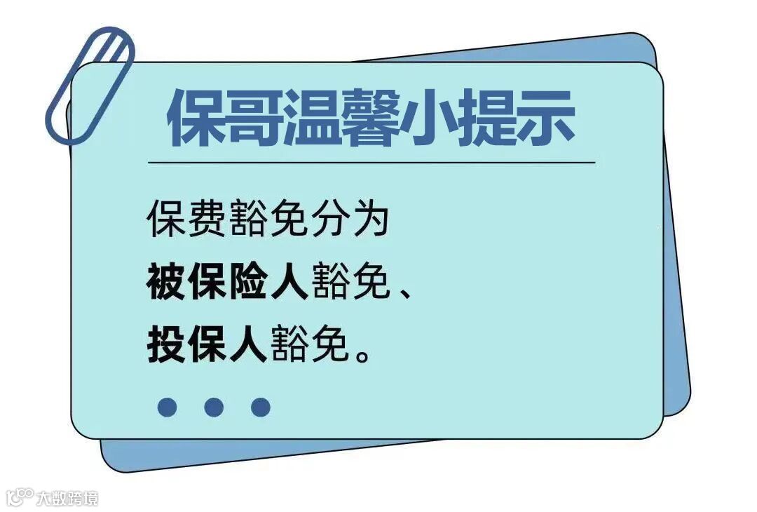 保费豁免,是指在保险合同规定的缴费期内,投保人或被保人达到某些特定的情况(如身故、残疾、重疾或轻症疾病等),由保险公司核准,同意投保人可以不再缴纳后续保费,保险合同仍然有效。