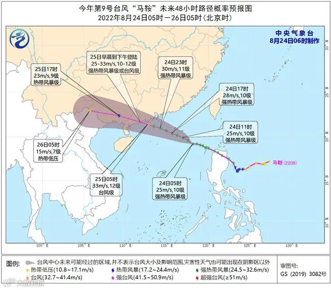 中央气象台发布台风黄色预警,今年第9号台风“马鞍”(强热带风暴级)的中心今天(24日)早晨5点钟位于广东阳江东偏南方向约700公里的南海北部海面上;将以每小时25公里左右的速度向西偏北方向移动,强度逐渐增强,并将于25日早晨到下午在广东深圳至湛江一带沿海登陆(25-33米/秒,10-12级,强热带风暴级或台风级)。
