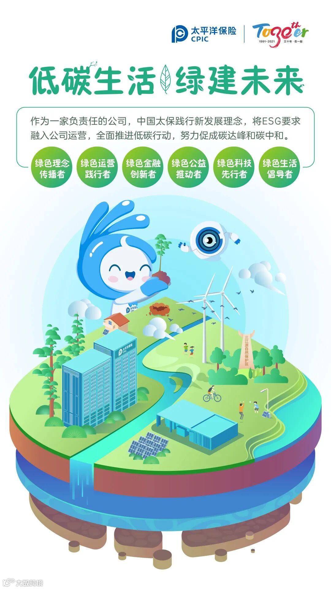 在“双循环”新发展格局下,中国太保将以国家“3060”碳目标为引领,持续深化ESG实践,在投资端、产品端、运营端扎实做好“双碳”各项工作,致力打造绿色理念的传播者、绿色金融的创新者、绿色科技的先行者、绿色运营的践行者、绿色公益的推动者、绿色生活的倡导者,为推进经济绿色转型践行更大担当,全方位助力高质量发展。