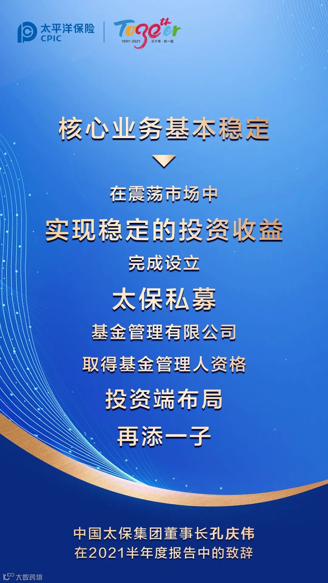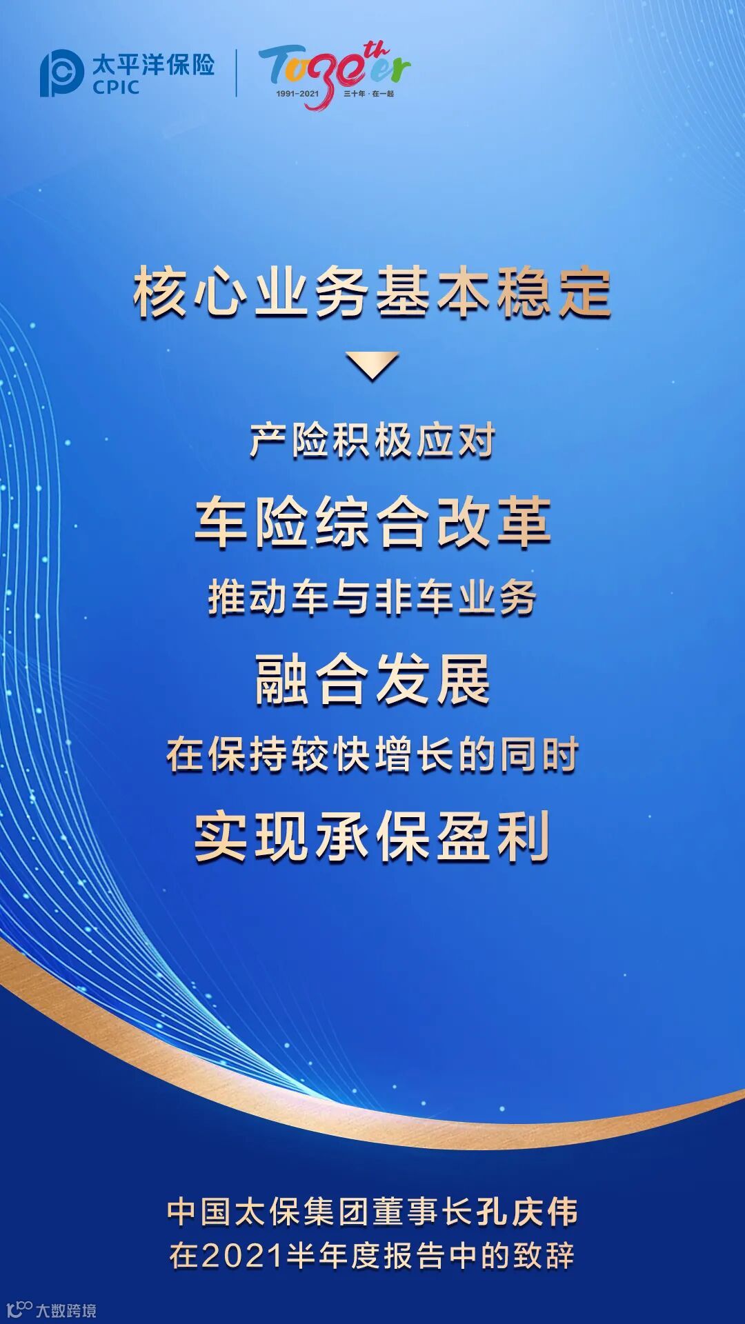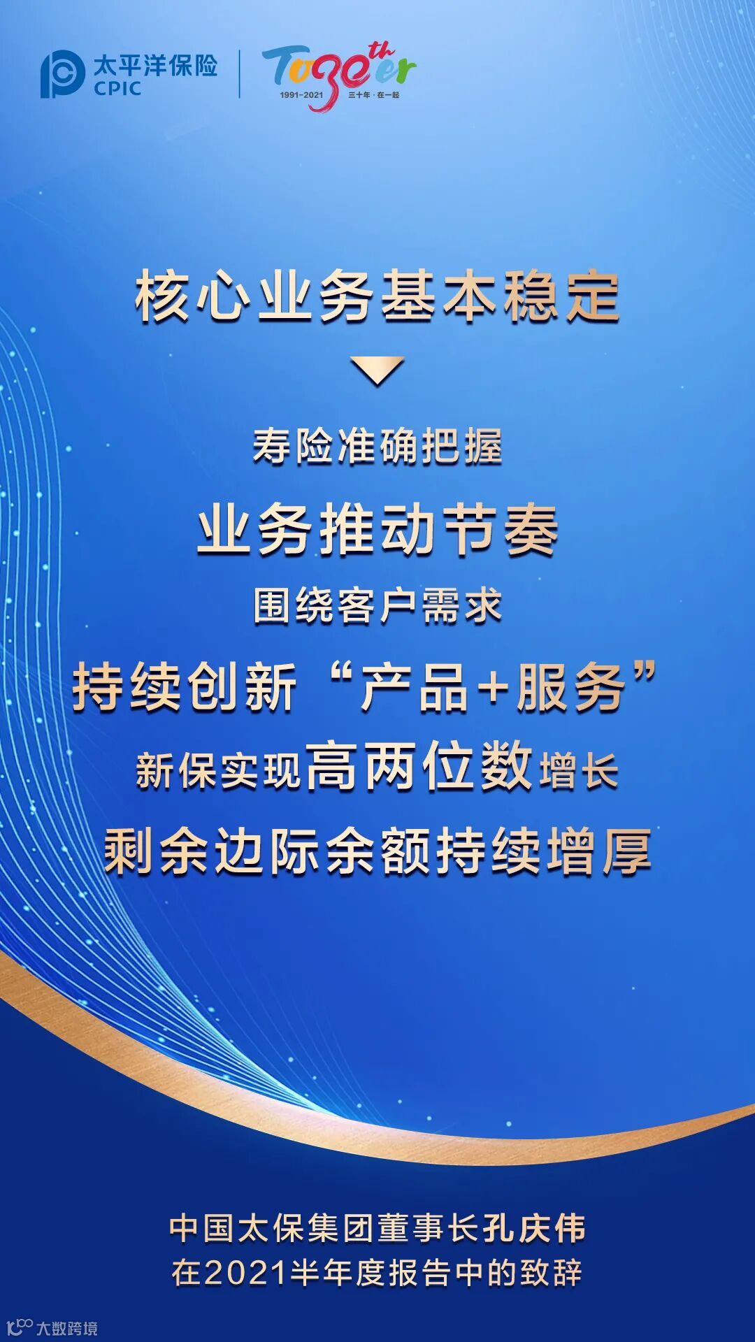 三十年来,中国太保始终聚焦主业、砥砺前行。而立之年的中国太保更加懂得“坚守价值、坚信长期”,始终坚持做“实”的事,做“难”的事,做“对”的事。2021年上半年,中国太保大健康战略落地施工,大数据战略启动推进,“太保服务”持续深化,可持续发展迈出新步伐。