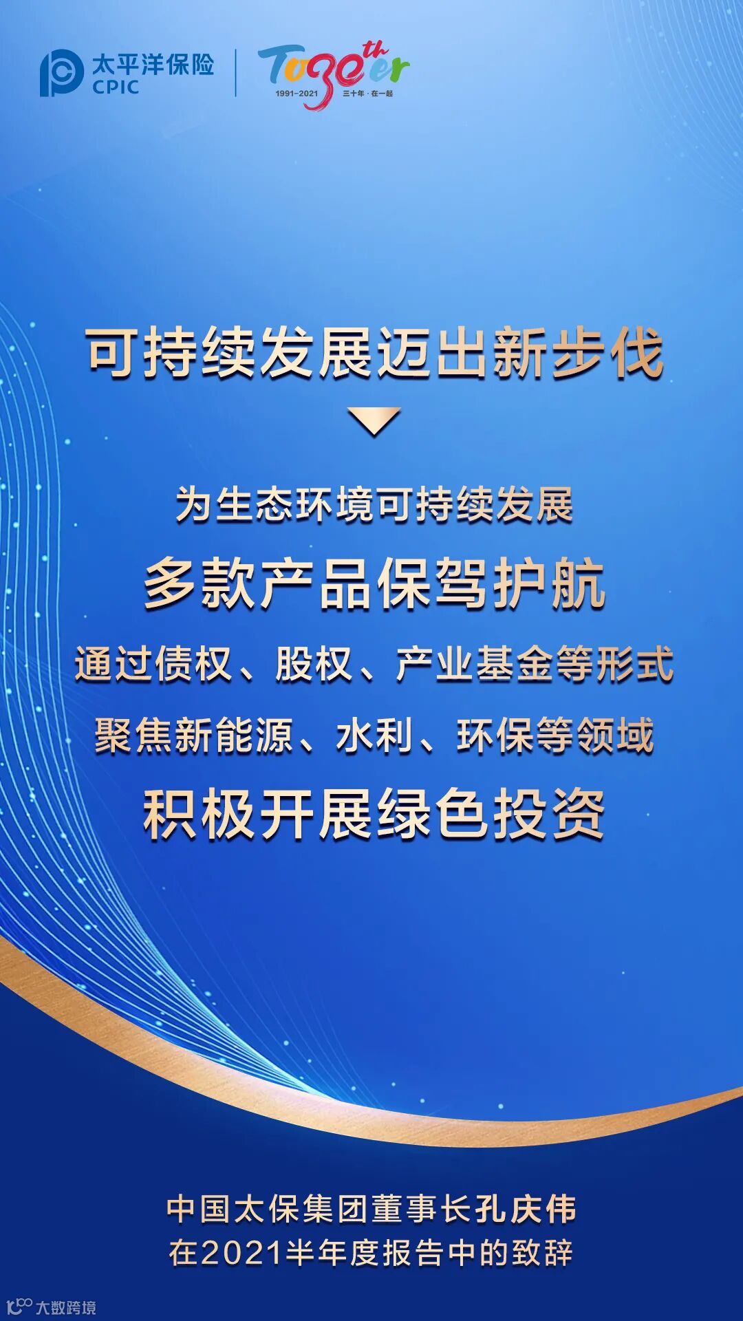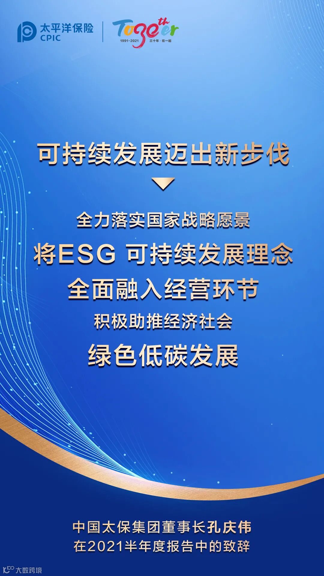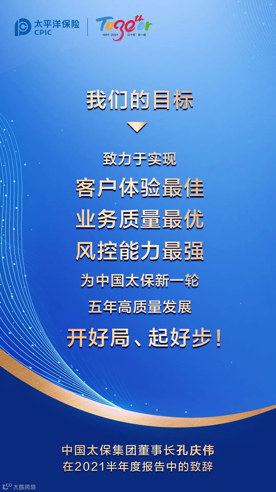 三十年来,中国太保始终聚焦主业、砥砺前行。而立之年的中国太保更加懂得“坚守价值、坚信长期”,始终坚持做“实”的事,做“难”的事,做“对”的事。2021年上半年,中国太保大健康战略落地施工,大数据战略启动推进,“太保服务”持续深化,可持续发展迈出新步伐。