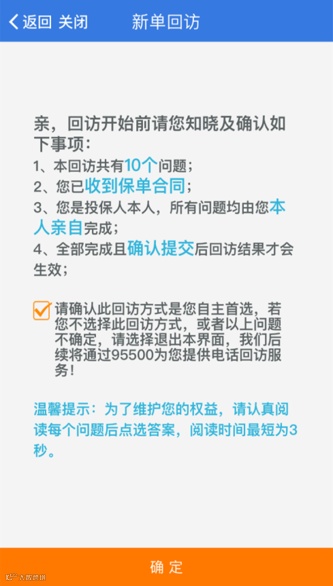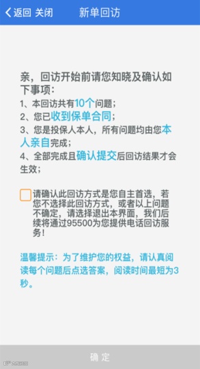 1、投保人自主选择回访方式,认可并确认使用此种回访方式,方能进行下一步操作