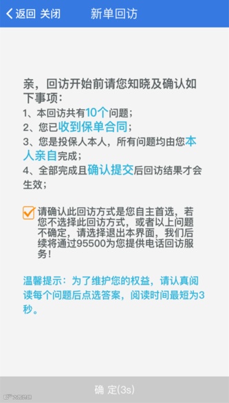 2、 每个问题最短阅读时长为3秒,倒计时结束后方可点选答案回答;以保证投保人仔细阅读知悉回访问卷内容