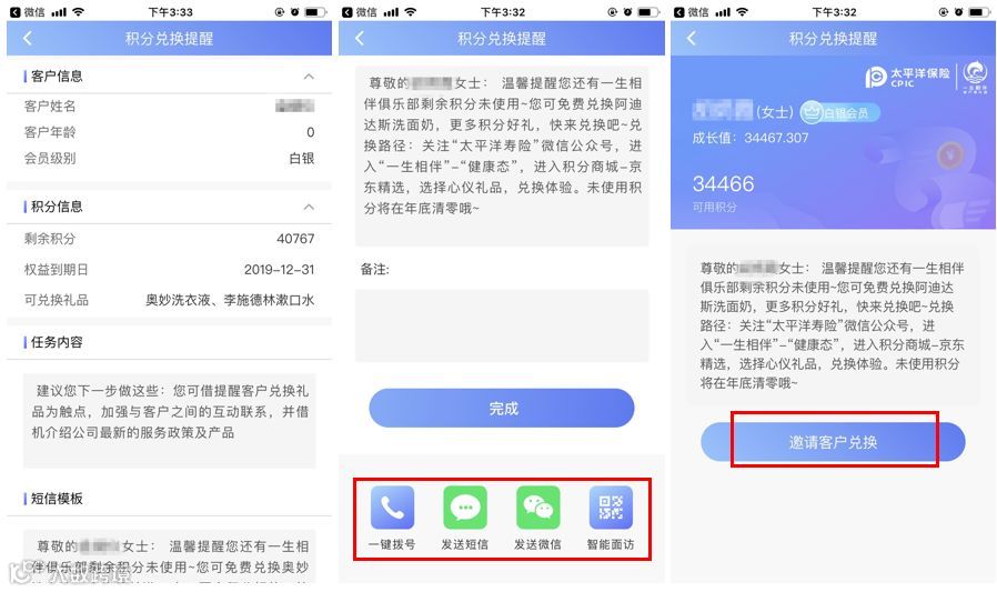 点击上一步中客户姓名,可查询客户积分情况、可兑换礼品推荐,并可选择电话、短信、微信、智能面访多种方式提醒客户。