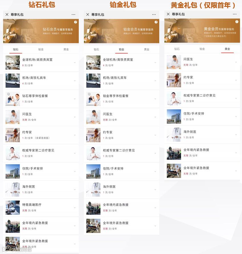 - 铂金、钻石会员每年可尊享一次高端体检;
