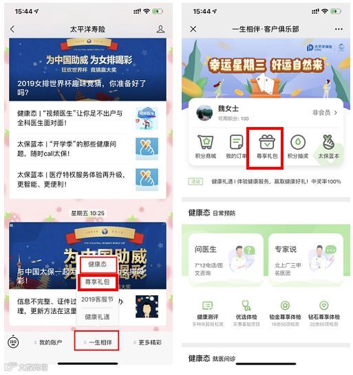 关注“太平洋寿险”官微,点击“一生相伴”,选择“健康态”,进入页面后点击“尊享礼包”;或直接点击点击“一生相伴”、“尊享礼包”快速进入尊享礼包。