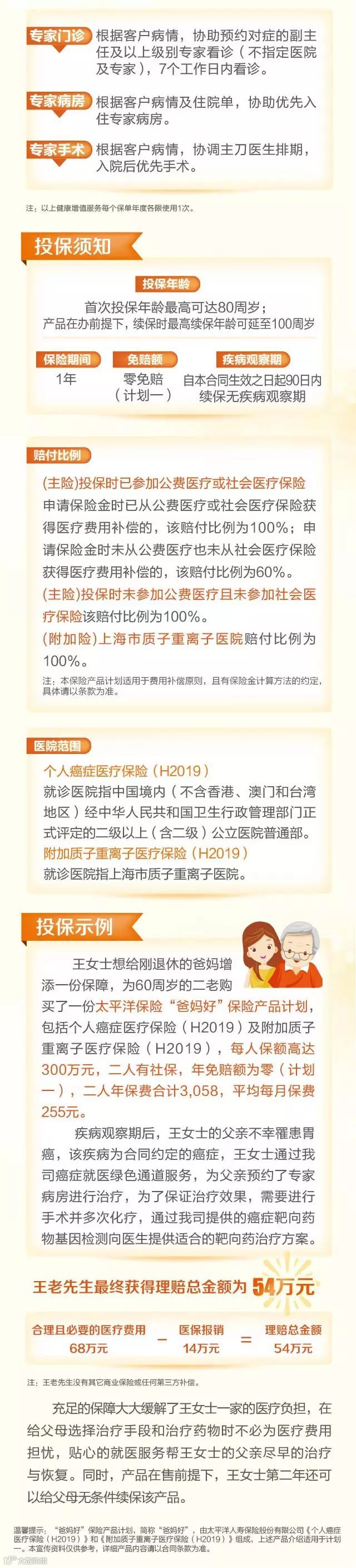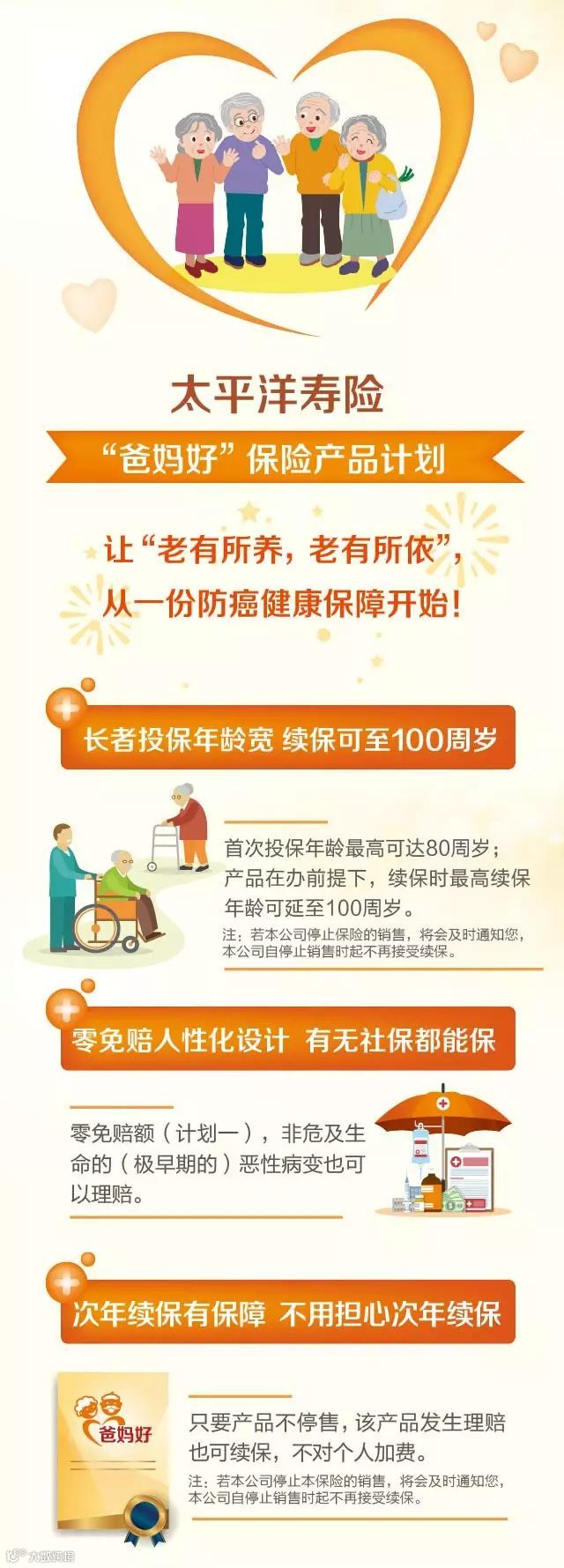 王女士的真实案例,切实告诉我们,在当今的保险业持续发展背景下,年龄已经不是投保的一大障碍,不同年龄段也可以选择到合适的产品。尤其是中老年人,现在除了可以选择防癌险外还可以选择防癌健康险,例如我们公司新推出的产品——“爸妈好”防癌健康保险计划!
