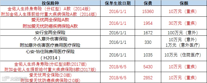 2018年6月5日,林太太再次为林先生加保了长期寿险和重疾险,如此一来,林先生的重疾个人保额累计达60万元。详细投保计划如下清单所示:
