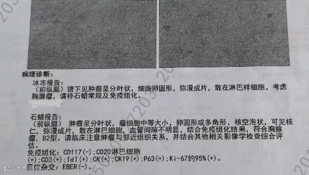 2019年5月,李先生所在高校组织教职工进行全身体检,拿到体检结果后提示有纵膈占位。医生也提醒他最好去三甲医院进一步详细检查一下。刚开始李先生感觉自己身体并无异样,既没有胸闷,也有没有疼痛咳嗽,以为是体检结果不大准。后来在细心的妻子提醒下,李先生于6月份来到当地的三甲医院进行胸部CT检查。检查结果出来,其胸部上纵膈有类似圆形的软组织肿物,最终医生诊断为胸腺瘤(B2型),需尽快手术和化疗。