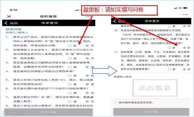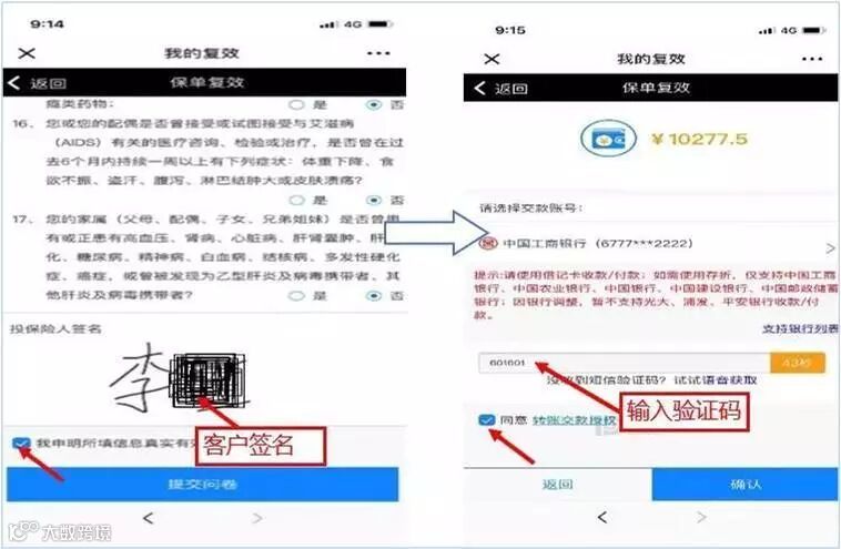④依次进行“投保人签名”、勾选声明,点击【提交问卷】,然后输入验证码、勾选转账交款授权,最后点击【确认】