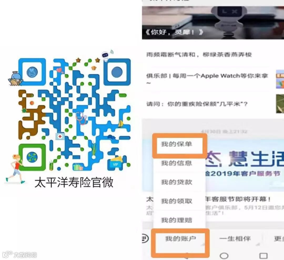 ①扫描二维码进入【太平洋寿险】官微,在主页面最下方选择【我的账户】,显示【我的保单】