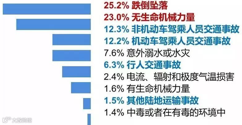 中国保险行业协会2017年9月发布了一份题为《中国保险人群意外伤害风险研究的报告》。本次报告系统、全面的做了意外风险的分析研究,数据触目惊心,其中: