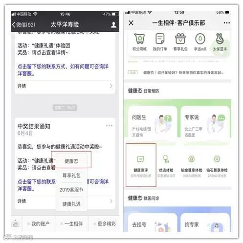 在太平洋寿险官微“一生相伴”的“健康态”进入,点击“健康测评”。