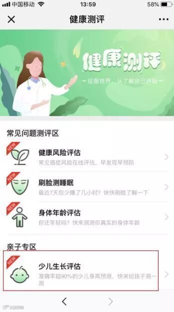 通过以上三种路径进入“健康测评”界面,找到“少儿生长评估”即可开始评估。