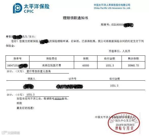 5月9日,吴经理获悉李女士的儿子小明因病住院后,马上前往客户家中探视。吴经理了解到李女士已经备齐了理赔所需资料,恰逢我司刚推出的微信小程序“太慧赔”,现场指导客户使用“太慧赔”申请理赔。不到两个小时,客户就收到了理赔款1031.3元。