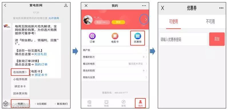 关注微信公众号爱电影网→购票→在线购票→我的→绑定手机号→优惠券→添加劵号