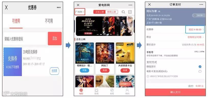 去购票→选择城市→选择影片/场次/座位→使用优惠券支付