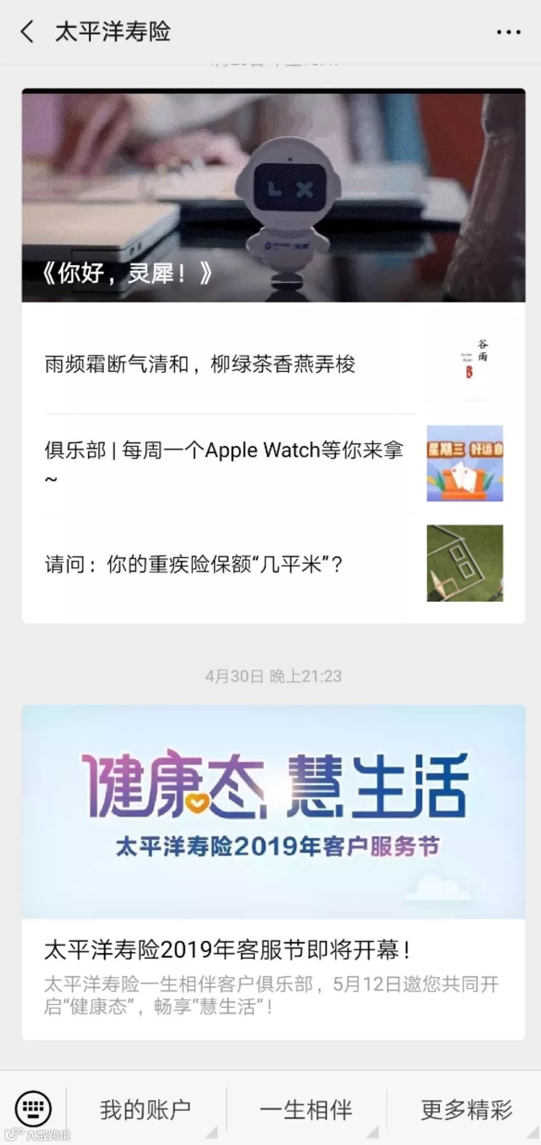 “太平洋寿险”官方微信公众号,为全体太平洋寿险客户服务,内含保单查询、回执回访、贷款服务等丰富功能,同时提供太保蓝本、健康养生、一生相伴客户俱乐部等活动项目,更有超多健康资讯及增值服务!