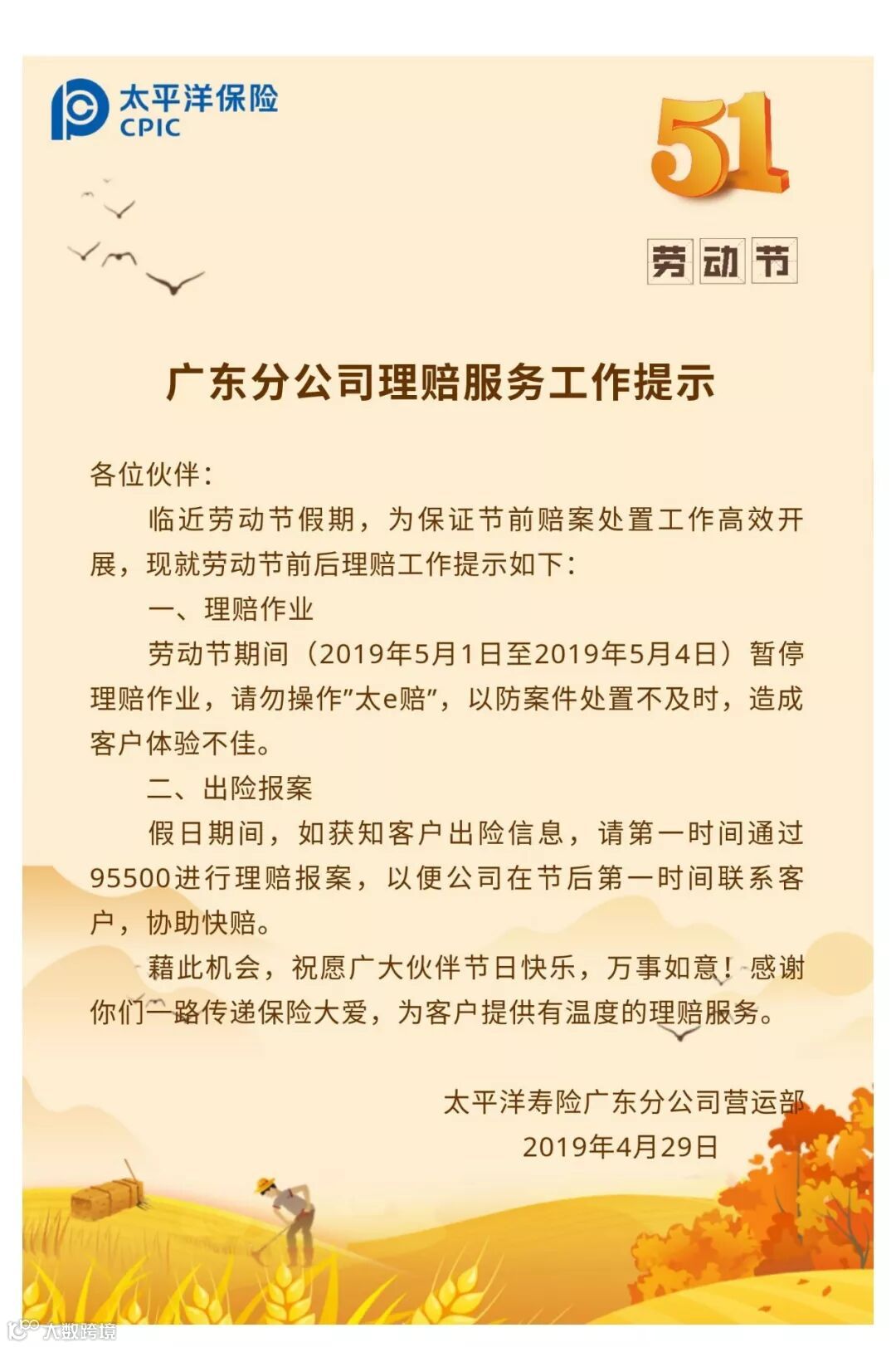 太平洋寿险广东分公司劳动节期间理赔服务工作提示