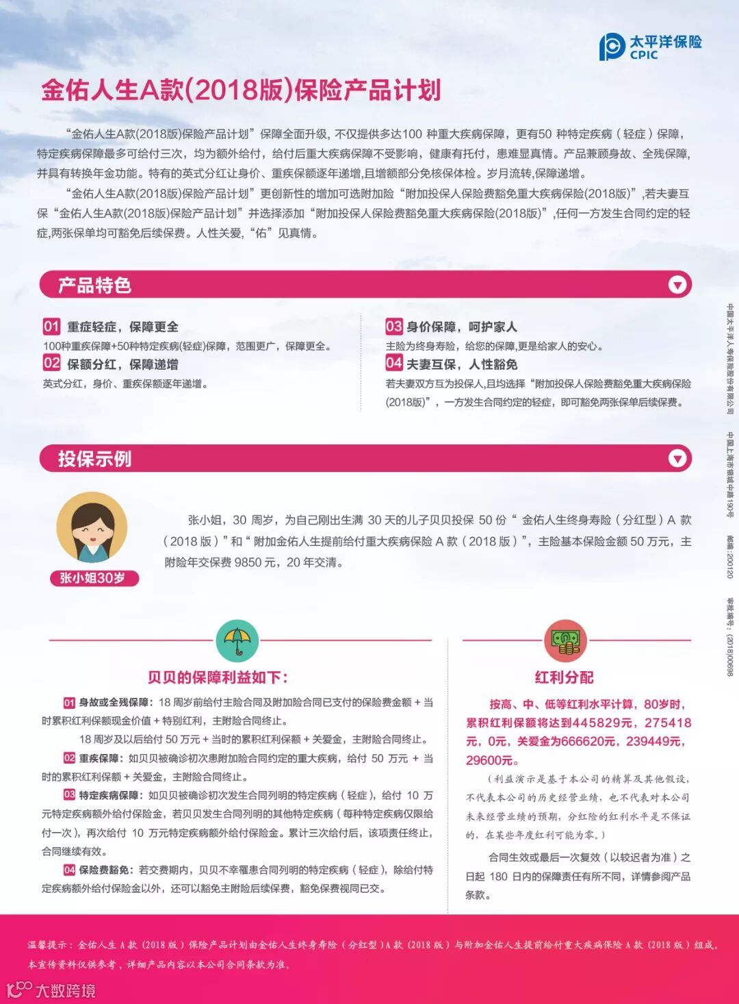 虽然所在单位也有为自己配置团体的意外险,但是单纯的意外保障,也满足不了她对风险转移的需求,尤其是上了年纪的中年女性,更需要有一份疾病保险进行防身。2015年1月1日,李女士在我司高级客户经理周旺兴的推荐下为自己投保了当时的热卖重疾产品——金佑人生终身寿险(分红型)A款(2014版),附加提前给付重达疾病保险,保额10万元,年缴保费5160元。